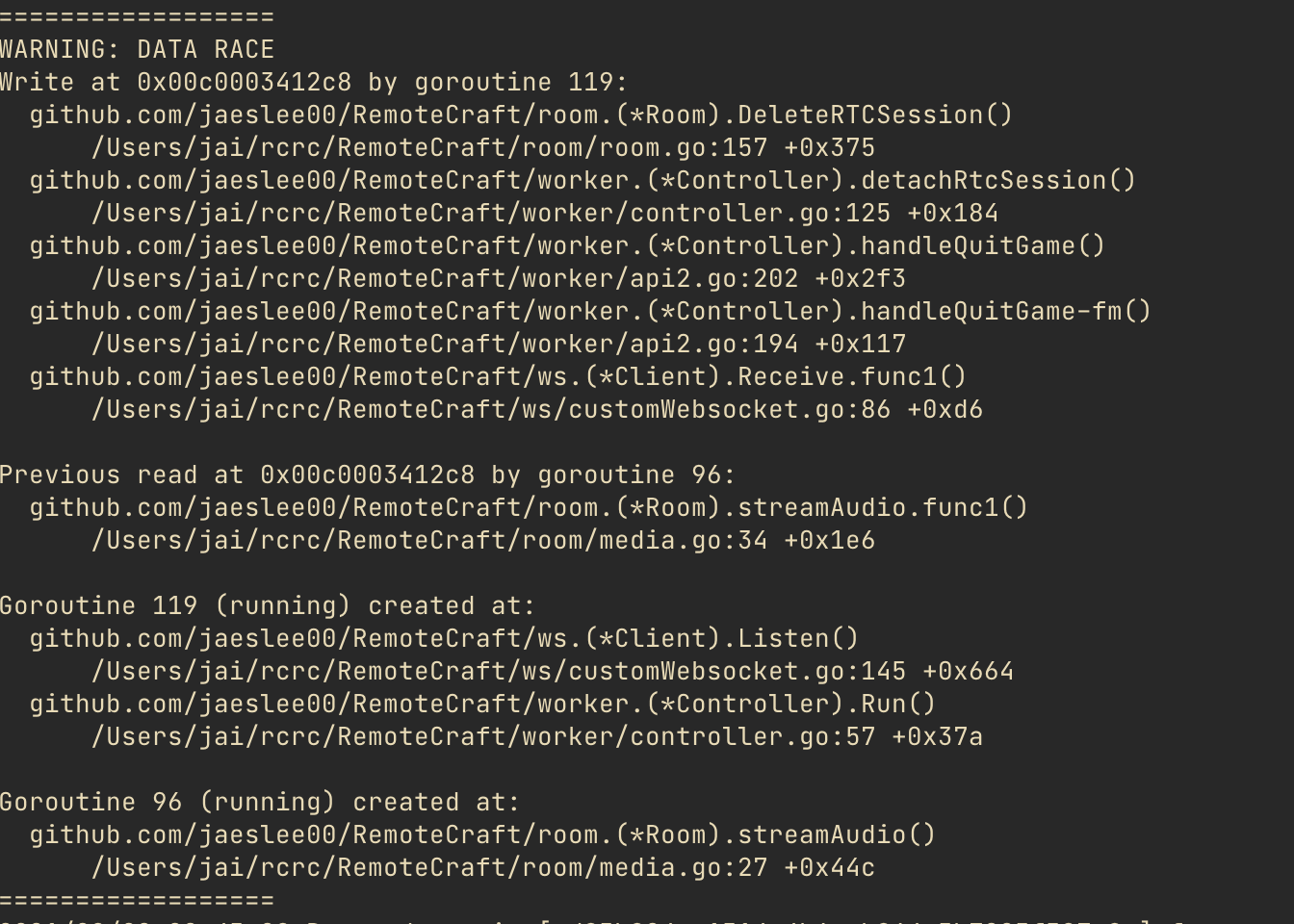 - Write at 0x00c0003412c8 by goroutine 119에 의하여 room.DeleteRTCSession(): 함수에서 메모리에 대한 쓰기가 발생!